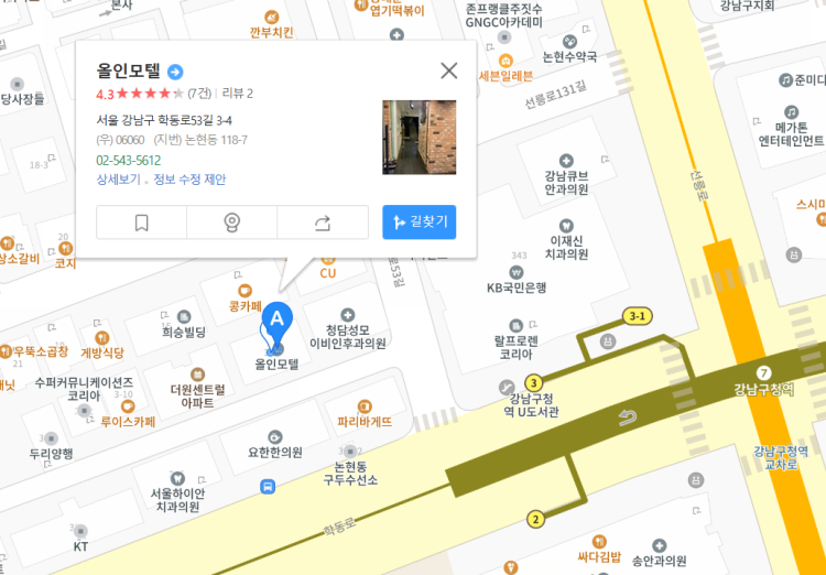강남구청역 3번 출구 바로 근처에 시설 좋은 올인모텔 추천합니다