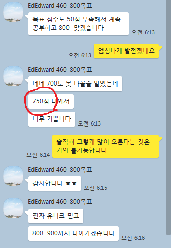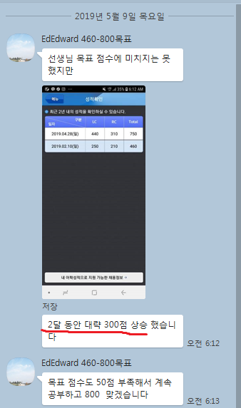 5-6등급 처음 시작하는 학습자 460점 →2달 수강한 후 750점(290점 상승)