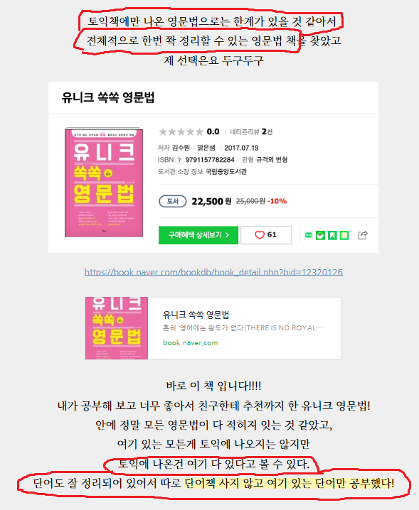 유니크 쏙쏙 영문법과 1600제, 2달 공부하여 705점, 1달 추가 공부하여→ 880점