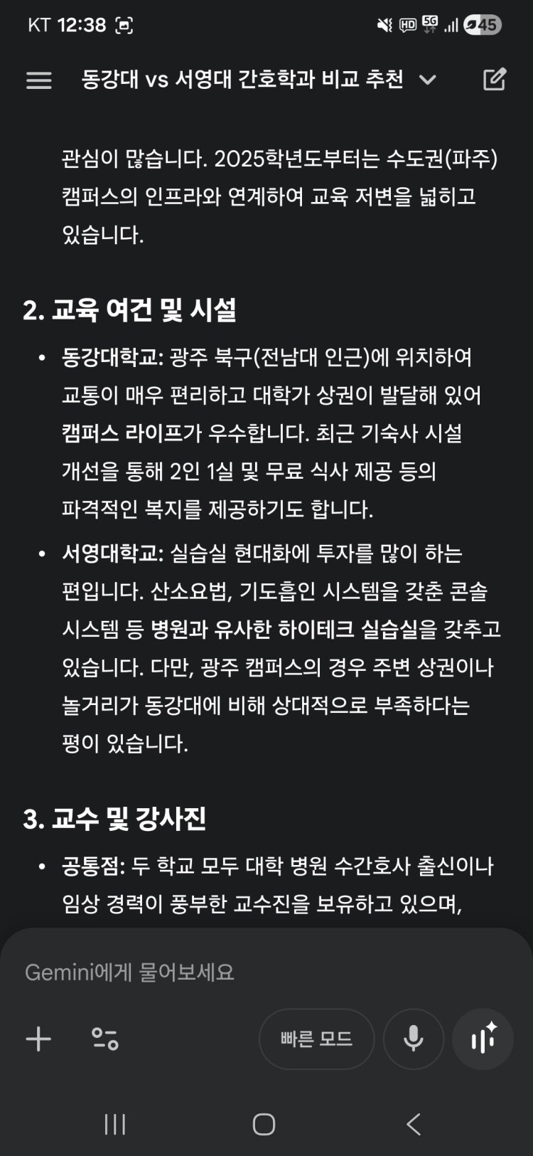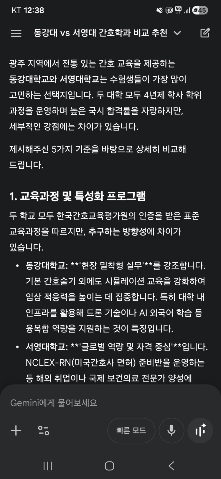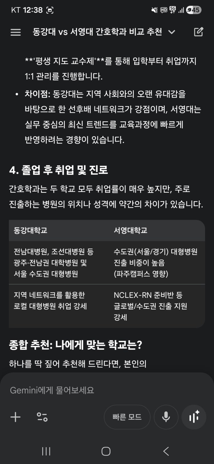 광주시내 생활권과 전남대병원 등 지역에 기반하는 취업이 우선적인 목표라면 동강대를 추천하고, 타지역이나 수도권으로 확장하거나 미국간호사 등으로 글로벌 확산적 진로를 모색한다면 서영대를 추천합니다.